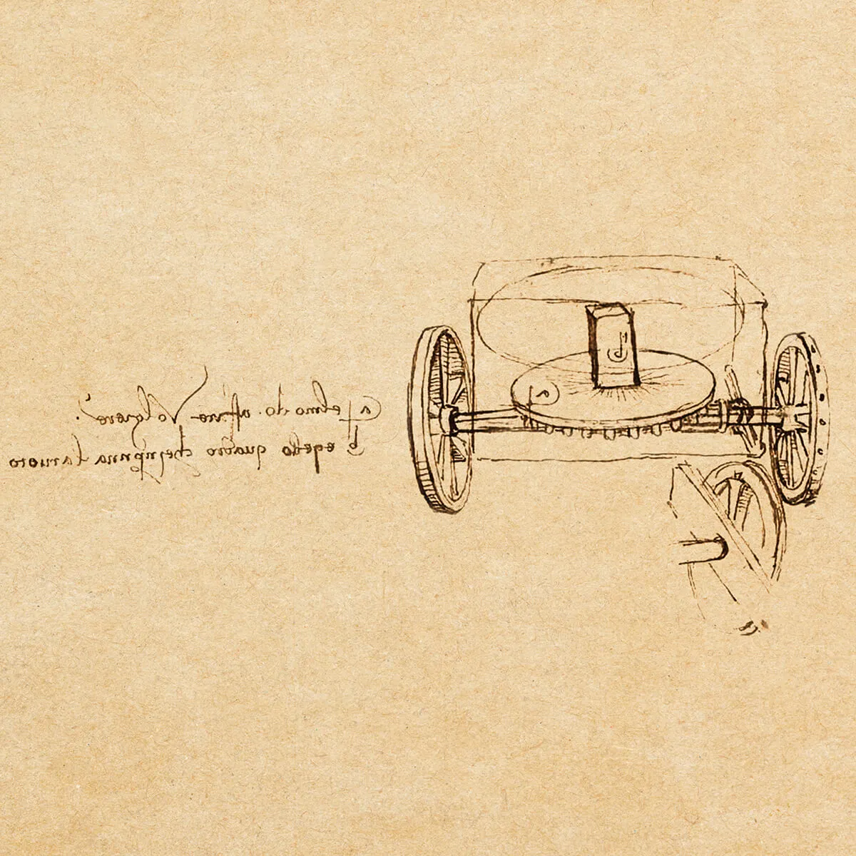 Dissenyat en principi per a una producció teatral a Milà, el disseny d'un vehicle paregut a un carro estava propulsat per un conjunt complex de molles, engranatges i mecanismes, i podia moure's sol. El vehicle podia moure's en línia recta o traçant una corba, i les rodes del darrere estaven equipades amb diferents engranatges que els permetien rodar de forma independent.