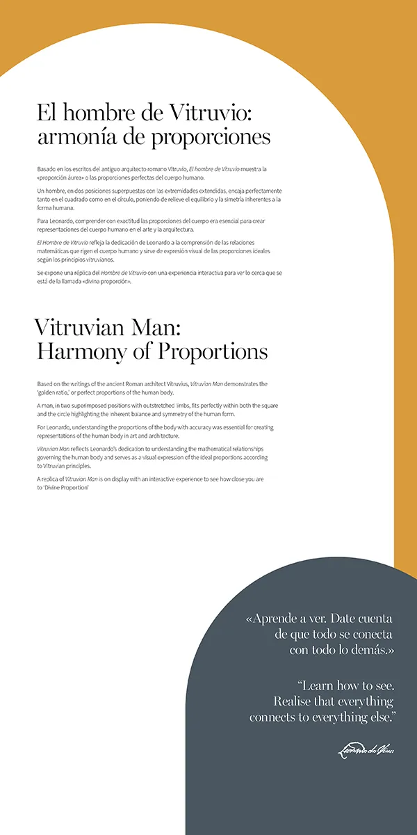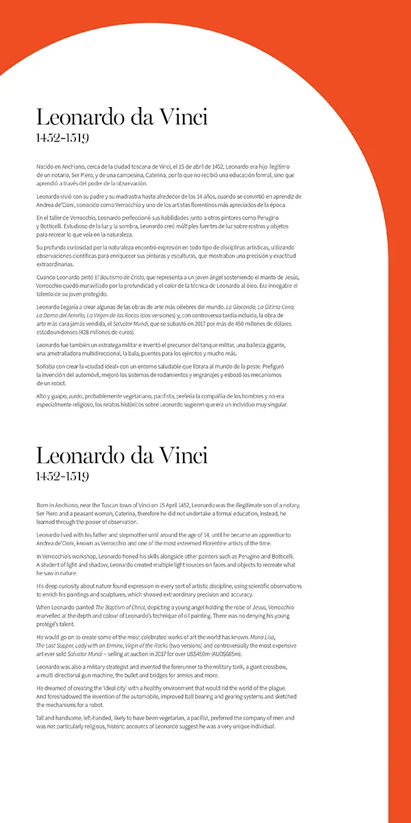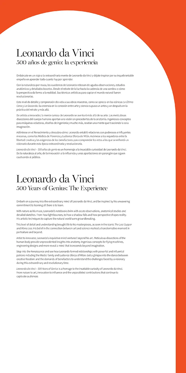 Leonardo da Vinci: 500 anys de geni és un homenatge a la insaciable curiositat de Leonardo da Vinci. De la naturalesa a l'art, de la innovació a la inspiració i a les aportacions sense parangó que continuen captivant el públic.