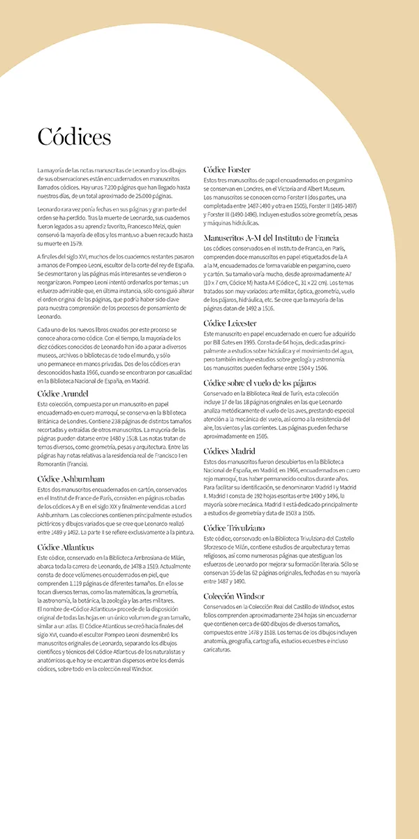 Còdexs de l'Institut de França Els còdexs conservats a l'Institut de França, a París, contenen dotze manuscrits en paper classificats de la A a la M, i enquadernats en pergamí, pell i cartó. Són de mides molt diferents, i oscil·len entre aproximadament un A7 (10 x 7 cm del còdex M) i un A4 (31 x 22 cm del còdex C). Abasten una àmplia gamma de temes, com l'art militar, l'òptica, la geometria, el vol dels ocells i la hidràulica. S'estima que la majoria de les pàgines daten de 1492 a 1516.