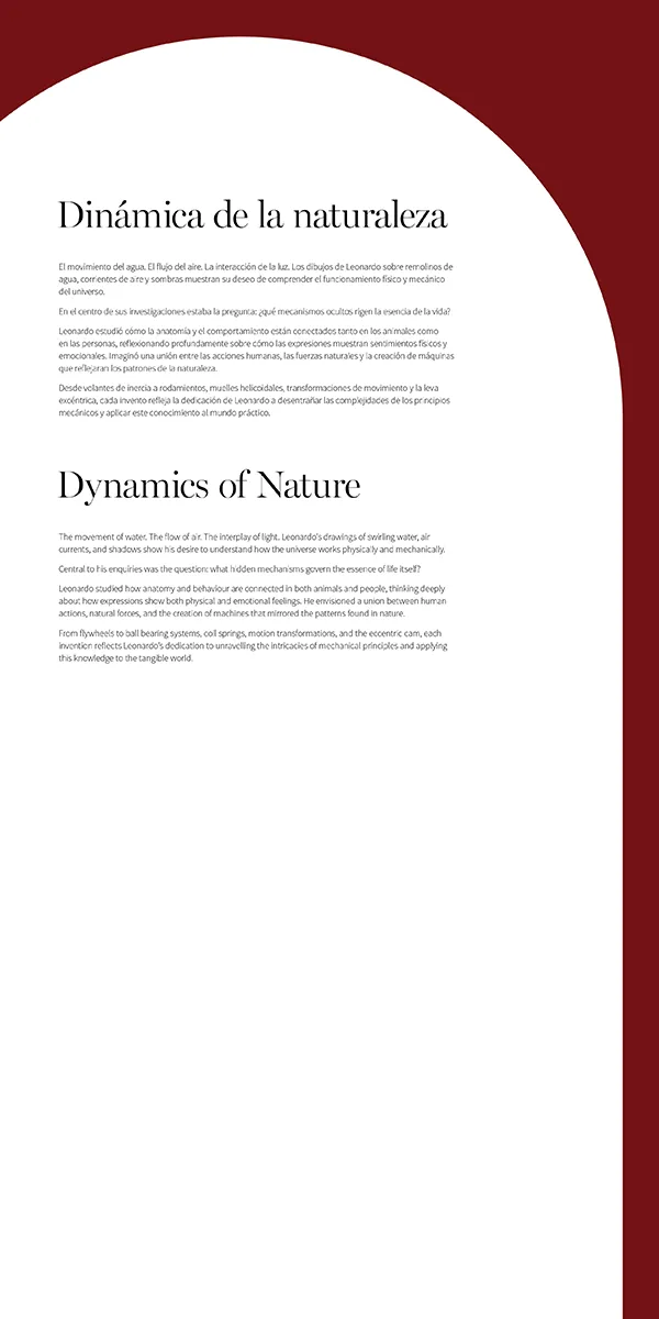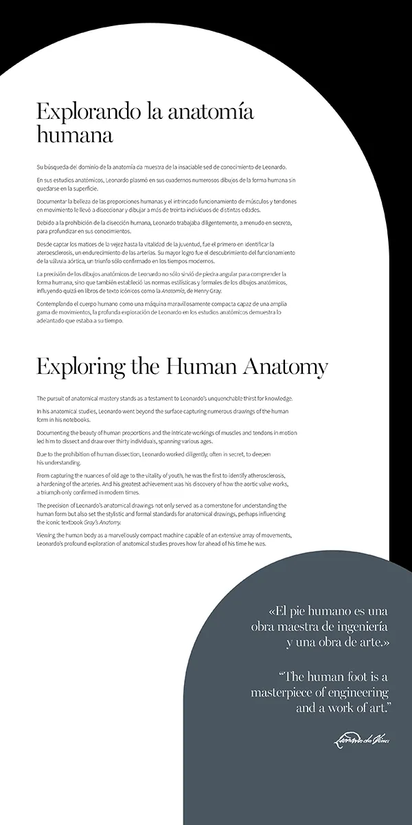 D'artista a innovador, la ment curiosa de Leonardo es va atrevir a anar més enllà del seu art. Les meticuloses disseccions del cos humà van oferir una visió sense precedents de l'anatomia. Els enginyosos dissenys de màquines voladores, els models d'enginyeria i molts més ens revelen una ment que va més enllà de la imaginació.