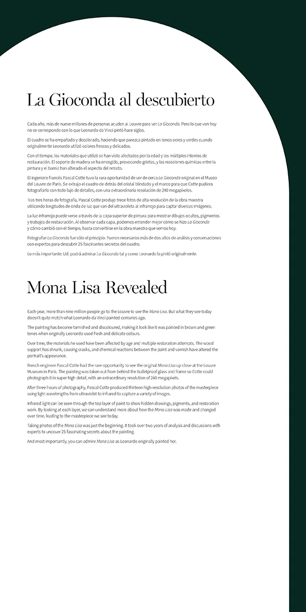 Pocs quadres són tan apreciats i estan tan protegits com la Mona Lisa. Conservada en una sala climatitzada darrere d'un vidre a prova de bales, només una minoria privilegiada tindrà alguna vegada l'oportunitat de veure-la de prop. Aquesta rèplica ens ofereix una oportunitat única de descobrir el que la part posterior de la pintura revela sobre la rica i tempestuosa història de la Mona Lisa.